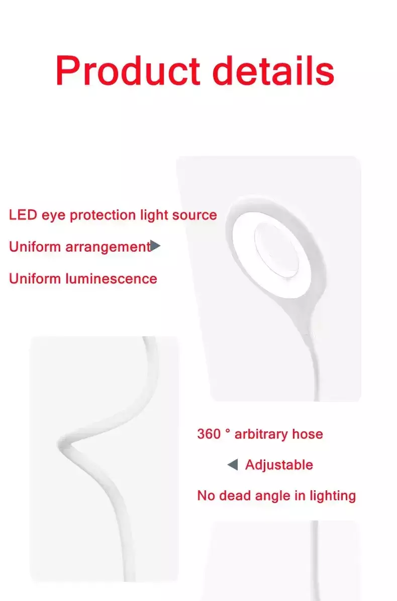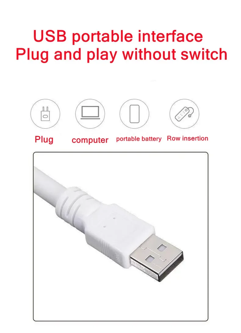 Product name: USB desk lampDimming mode: plug and lightingNumber of beads: 12Rated power: 2.5WRated input: DC 5VProduct color: white shellConvenient and easy to use: USB interface is widely used in various devices, such as computers, mobile phones, tablet computers, etc. It is very convenient to charge only one USB data cable. Higher stability, no damage to equipment, and no fire risk during charging. Better control of electricity consumption and reduction of energy waste will help to save energy and reduce environmental pollution.
